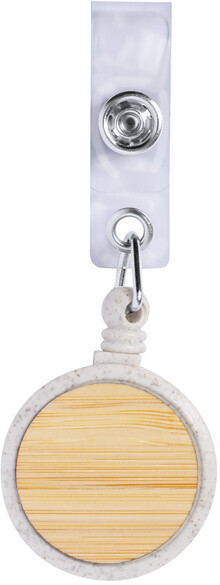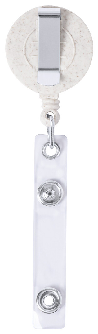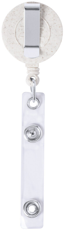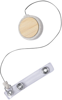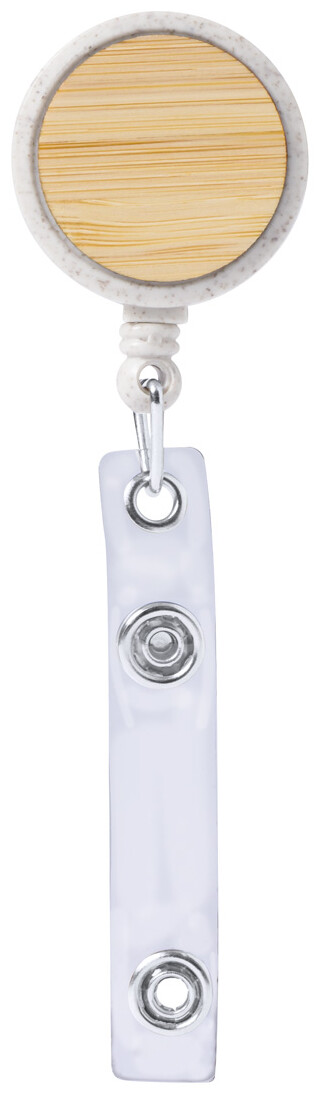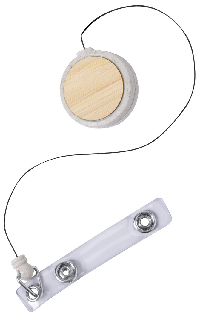 Ekologický držák z pšeničné slámy z plastu a bambusu se zapínáním na druky, teleskopickou šňůrou a kovovou sponou.
