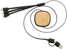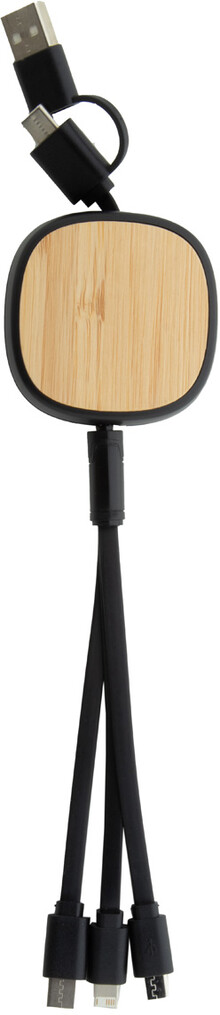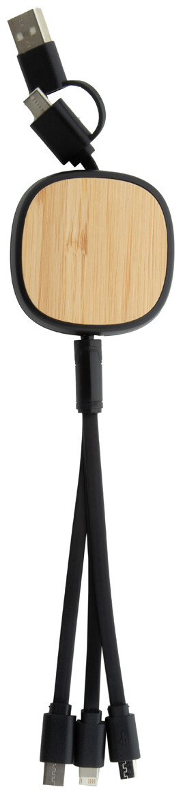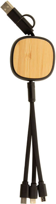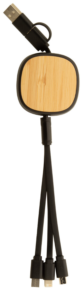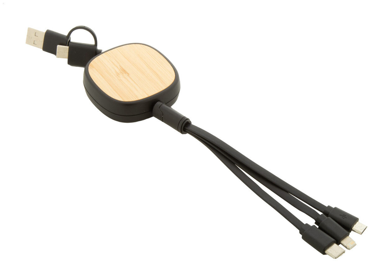 Teleskopický nabíjecí kabel USB z recyklovaného ABS a bambusu. S konektory micro USB, USB-C a Lightning. Se vstupy USB a USB-C.