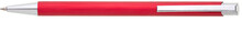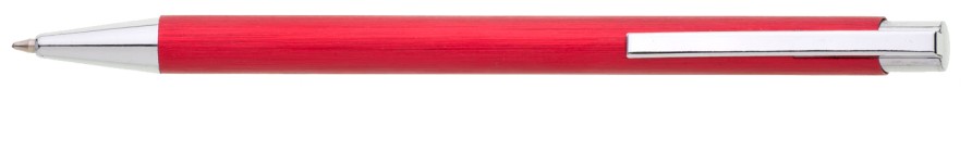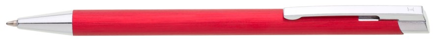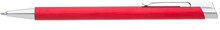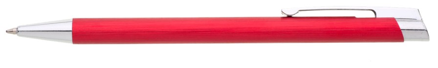Červená kovová propiska s jemně rýhovaným povrchem.