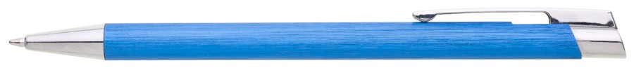 Modrá kovová propiska s jemně rýhovaným povrchem.