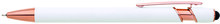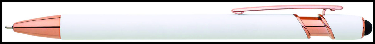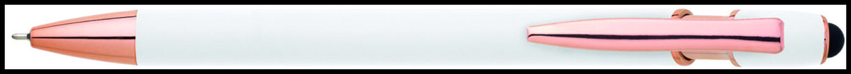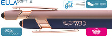 Kovová propiska se soft povrchem, touch koncovkou a doplňky v růžovo-zlaté barvě. Laserované logo je lesklé, růžovo-zlaté. Náplň semigelová, modře píšící.