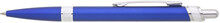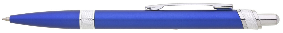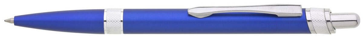 Plastová propiska s metalickým modrým povrchem a chromovými ozdobnými detaily. Velkoobsahová, modře píšící náplň.