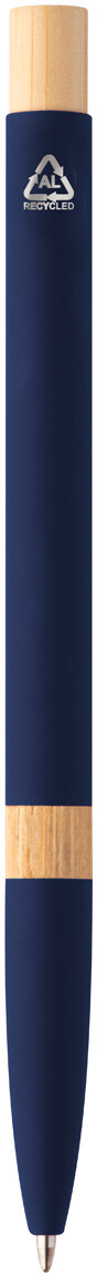 Kuličkové pero z recyklovaného hliníku s bambusovými částmi, pogumovaným povrchem a chromovým klipem. Se speciální vrstvou pro zrcadlové laserové gravírování. S modrou náplní.