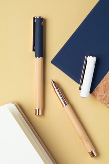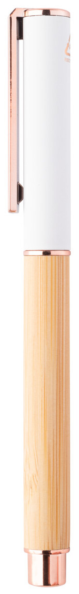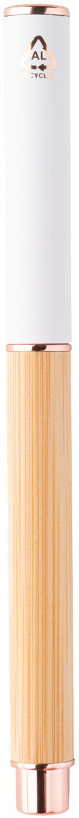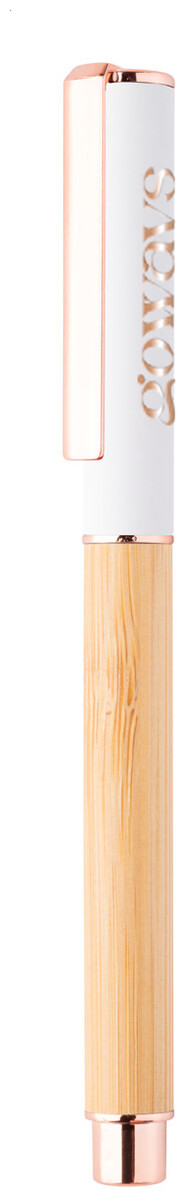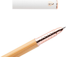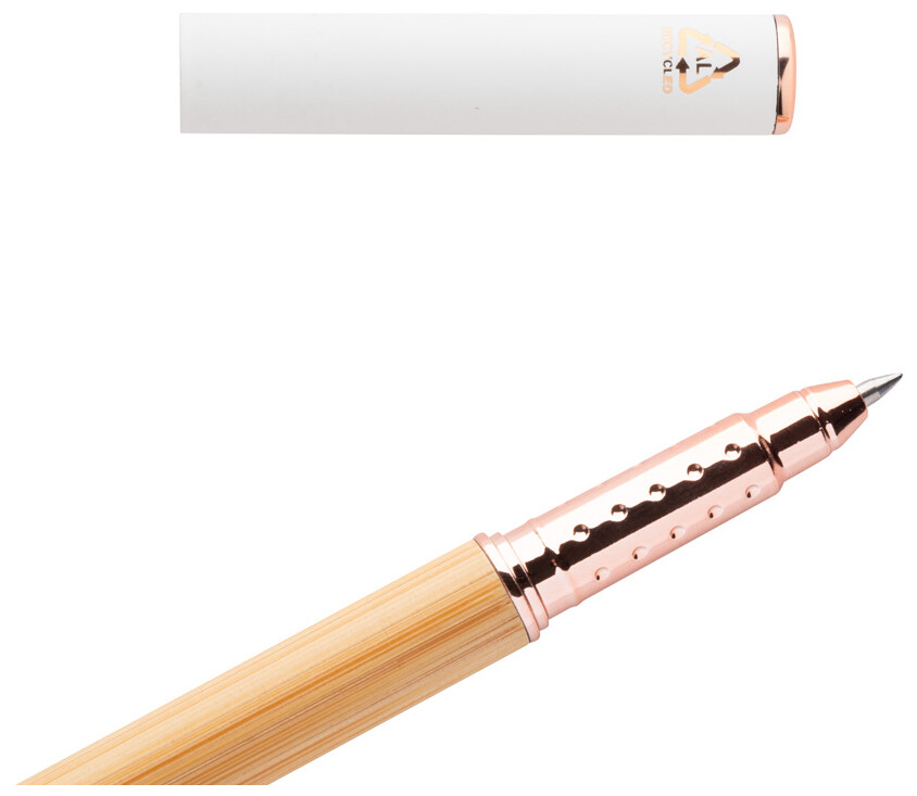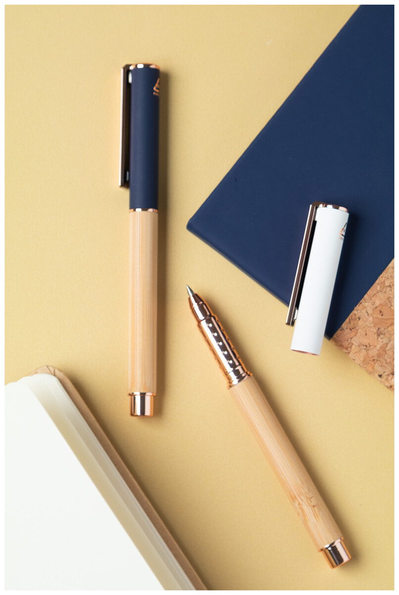 Roller pero z bambusu a recyklovaného hliníku s pogumovaným uzávěrem a detaily z růžového zlata. Se speciální povrchovou úpravou pro zrcadlové laserové gravírování v barvě růžového zlata. S modrou náplní.