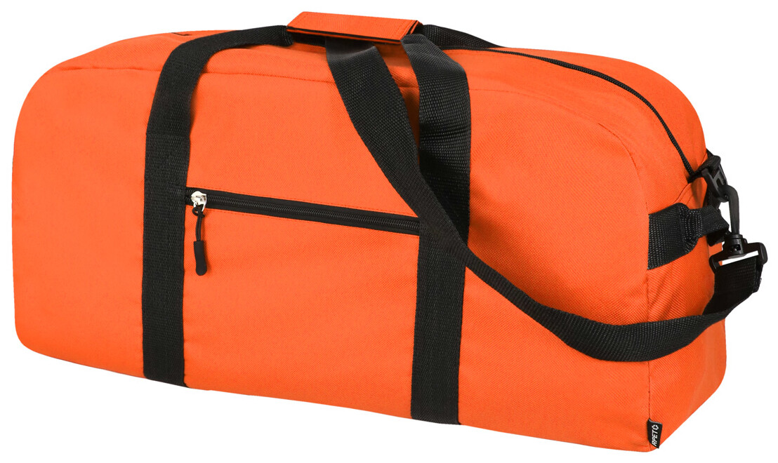 Sportovní taška RPET s hlavními přihrádkami na zip a přední kapsou, nastavitelný ramenní popruh. Polyester 600D RPET, s výrazným štítkem RPET.