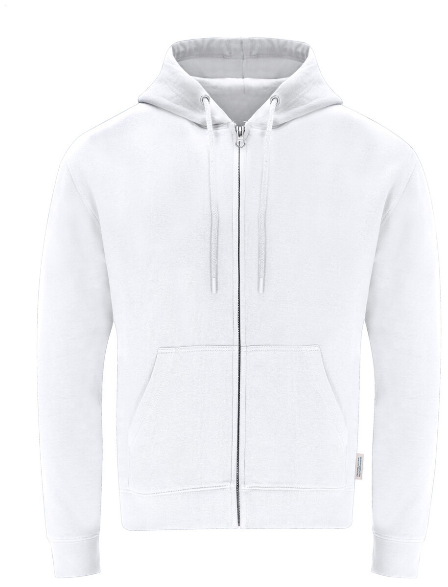 Mikina s kapucí na zip a předními kapsami ze 60% organické bavlny a 40% RPET polyesteru, 280 g/m2.