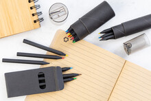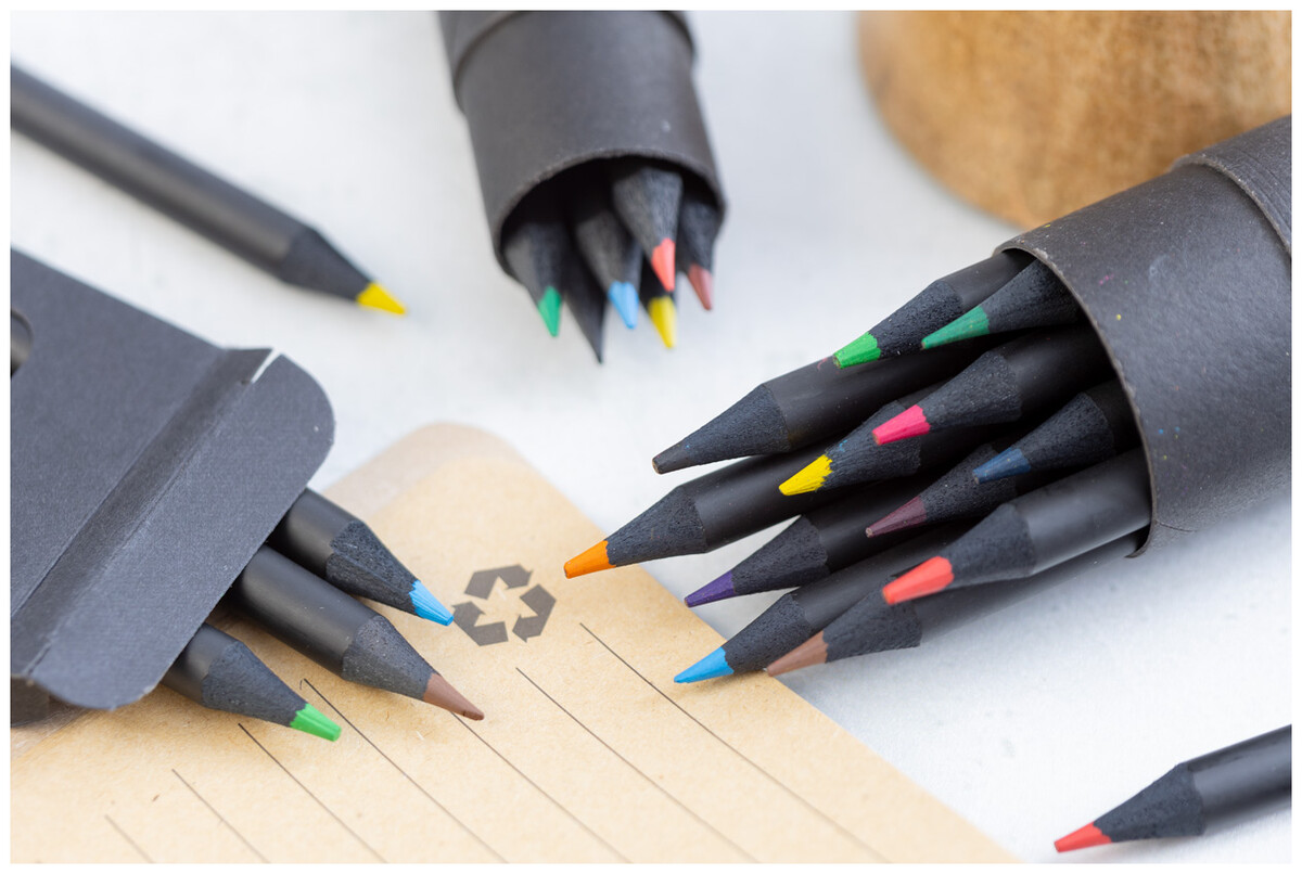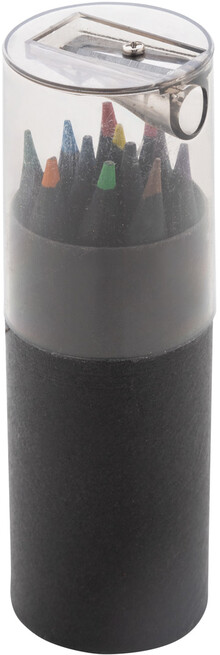 12dílná sada pastelek z černého dřeva v kulatém černém pouzdře z kartonu s plastovým ořezávátkem.