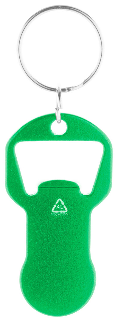 Přívěšek na klíče s otvírákem na láhve z recyklovaného hliníku s žetonem do nákupního vozíku.