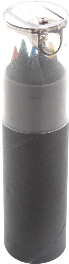 6dílná sada pastelek z černého dřeva v kulatém černém pouzdře z kartonu s plastovým ořezávátkem.