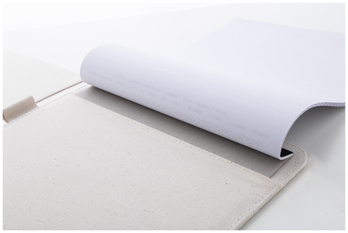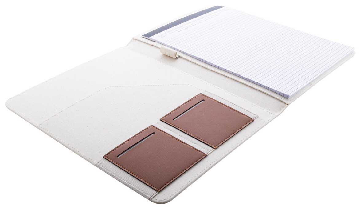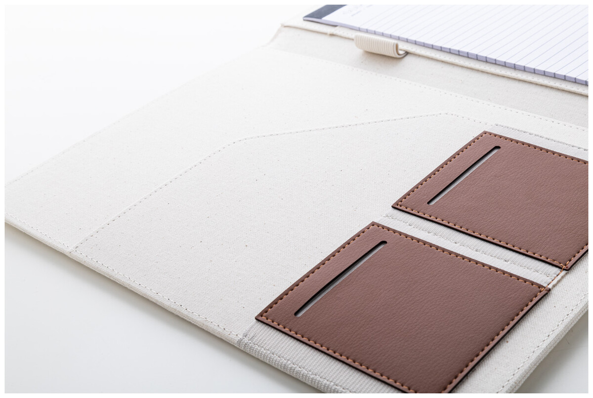 Sloha A4 na dokumenty z recyklovaného plátna a recyklované PU kůže s několika vnitřními kapsami na organizér. S 20 linkovanými listy poznámkového bloku z recyklovaného papíru. 70% recyklovaná bavlna a 30% RPET polyester.