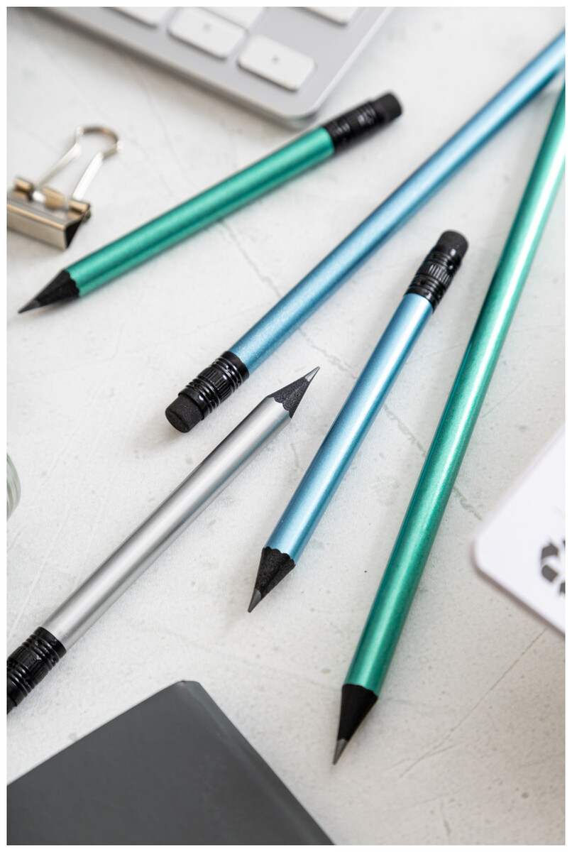 Černá dřevěná tužka v metalickém provedení, s černou gumou. Ořezaná, třída HB.