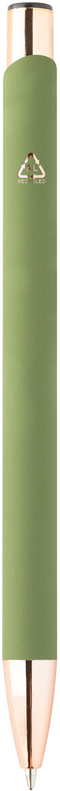 Kuličkové pero z recyklovaného hliníku s pogumovaným povrchem a detaily v barvě růžového zlata. Se speciální povrchovou úpravou pro zrcadlové laserové gravírování v barvě růžového zlata. S modrou náplní.