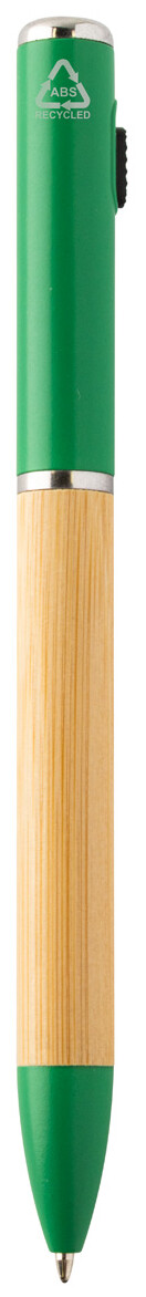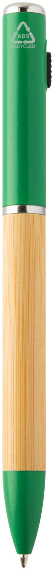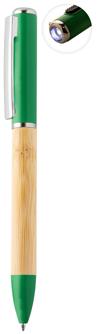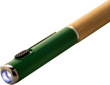 Kuličkové pero z bambusu a recyklovaného ABS plastu s 1 LED svítilnou. S modrou náplní a knoflíkovou baterií.