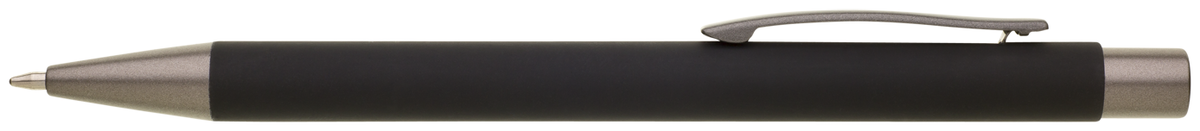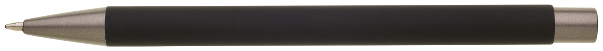 Kovová propiska CAGERI SOFT s hnědo-černými doplňky, s černým pogumovaným povrchem. Velkoobsahová modrá náplň.
