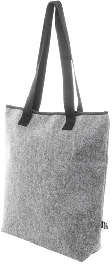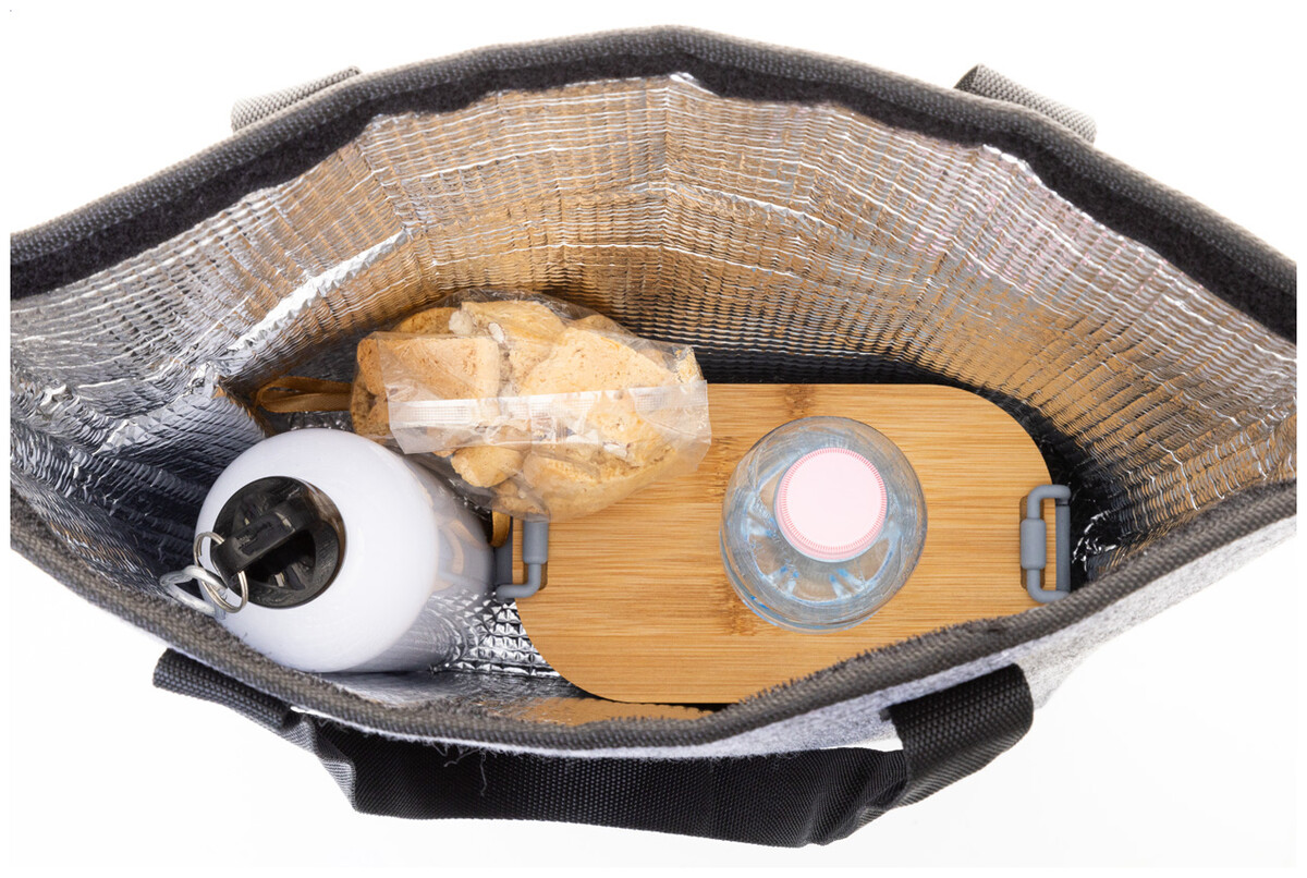 Chladicí nákupní taška z RPET plsti s hliníkovou výplní. Se zapínáním na suchý zip, přední kapsou na zip a dlouhými uchy. S výrazným štítkem RPET.