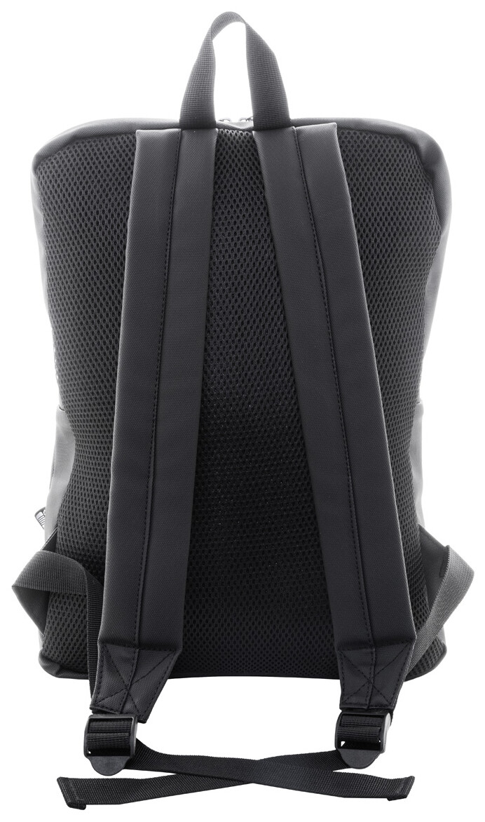 Vodotěsný tenký batoh na notebook RPET s přihrádkou na notebook (15") na zip a přední kapsou na zip. S polstrovanými zády a ramenními popruhy. Polyester 600D RPET potažený PU, s výrazným štítkem RPET.
