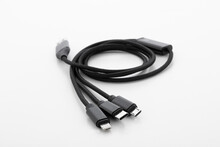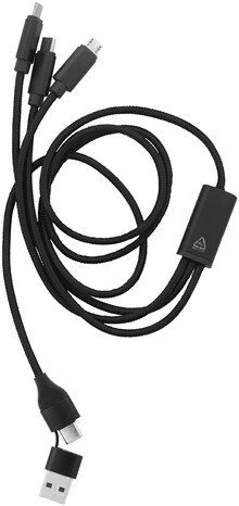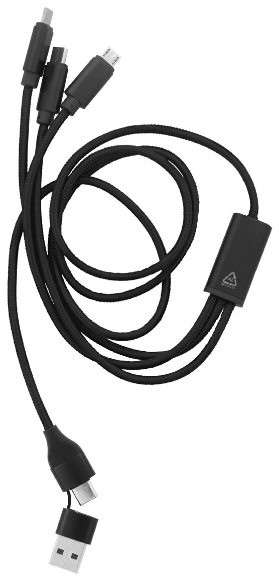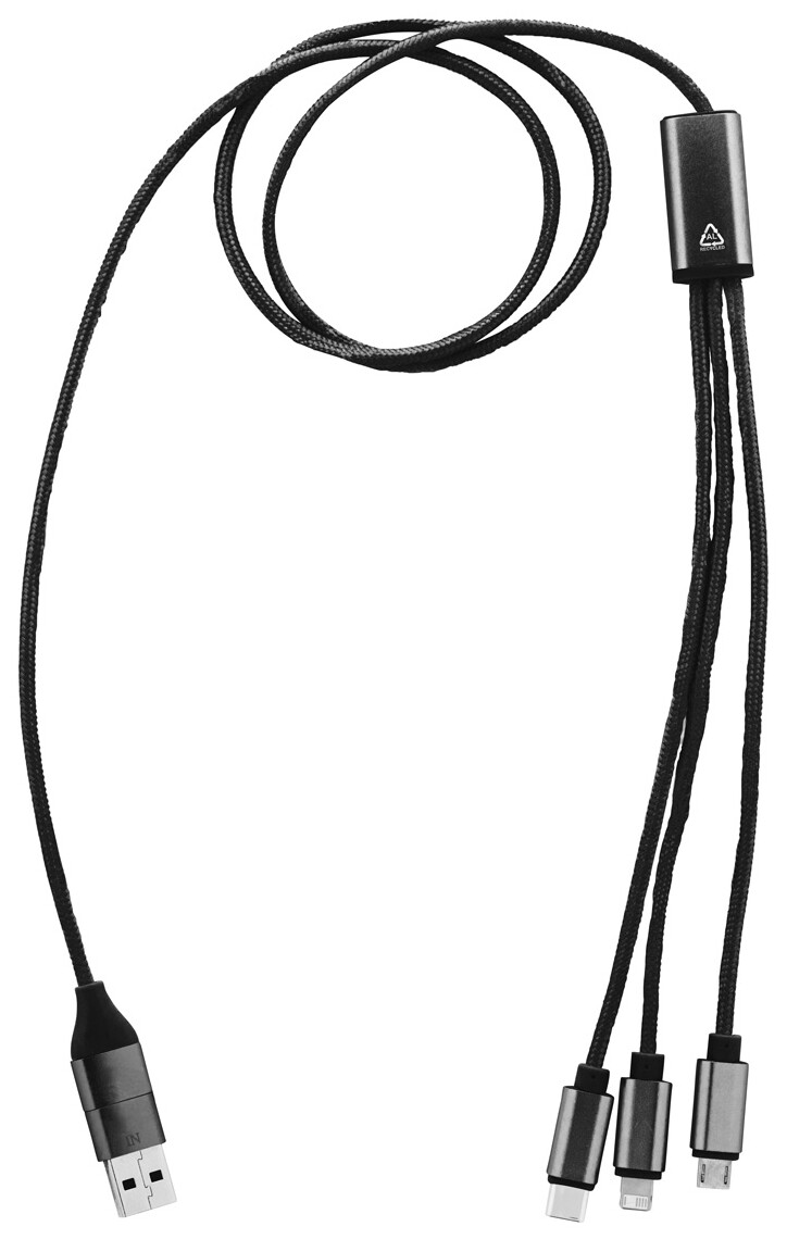 USB nabíjecí kabel z recyklovaného hliníku a RPET s konektory micro USB, USB-C a Lightning. Se vstupy USB a USB-C. Délka kabelu: 100 cm.