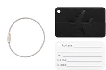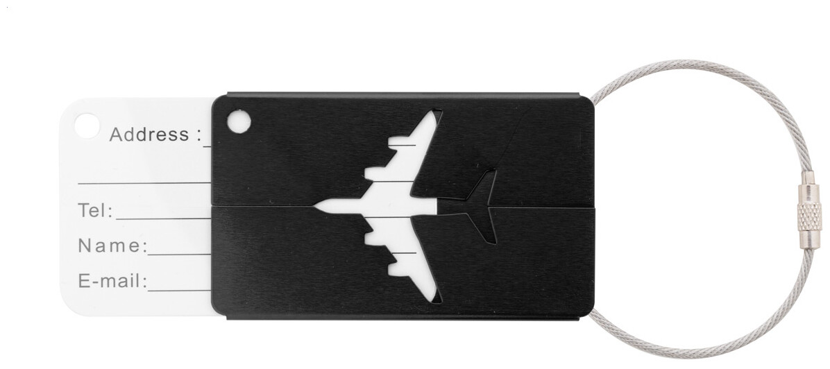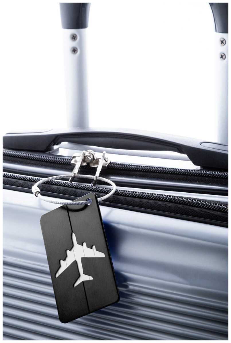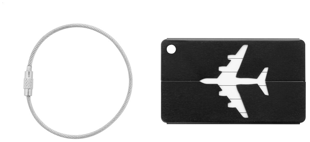 Hliníková visačka na zavazadla s motivem letadla a kovovým lankem.
