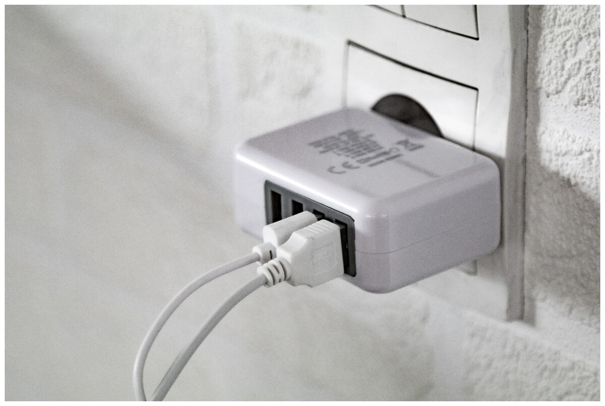 Plastová USB nabíječka do zásuvky se 4 porty. Max. výstup 3100 mA.