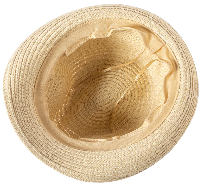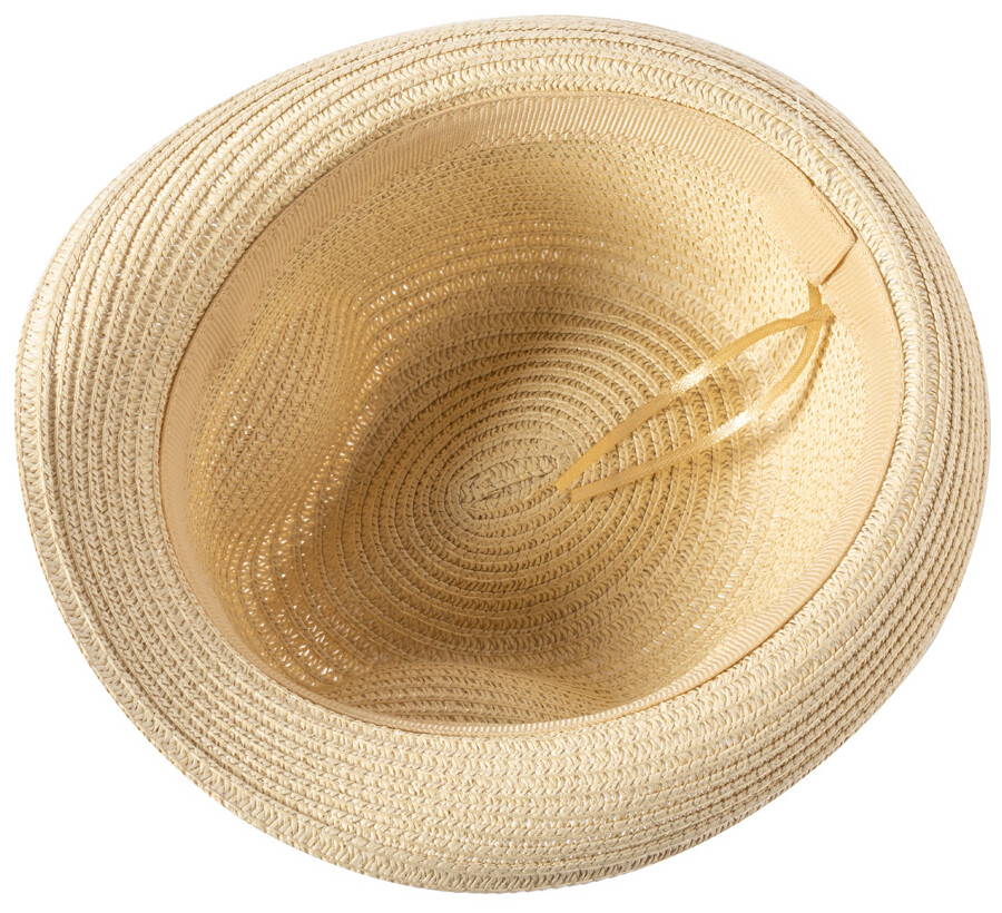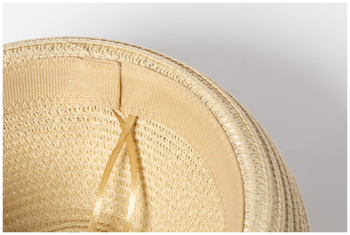 Unisex slaměný klobouk ze syntetických vláken s ozdobným páskem a nastavitelnou vnitřní stuhou.