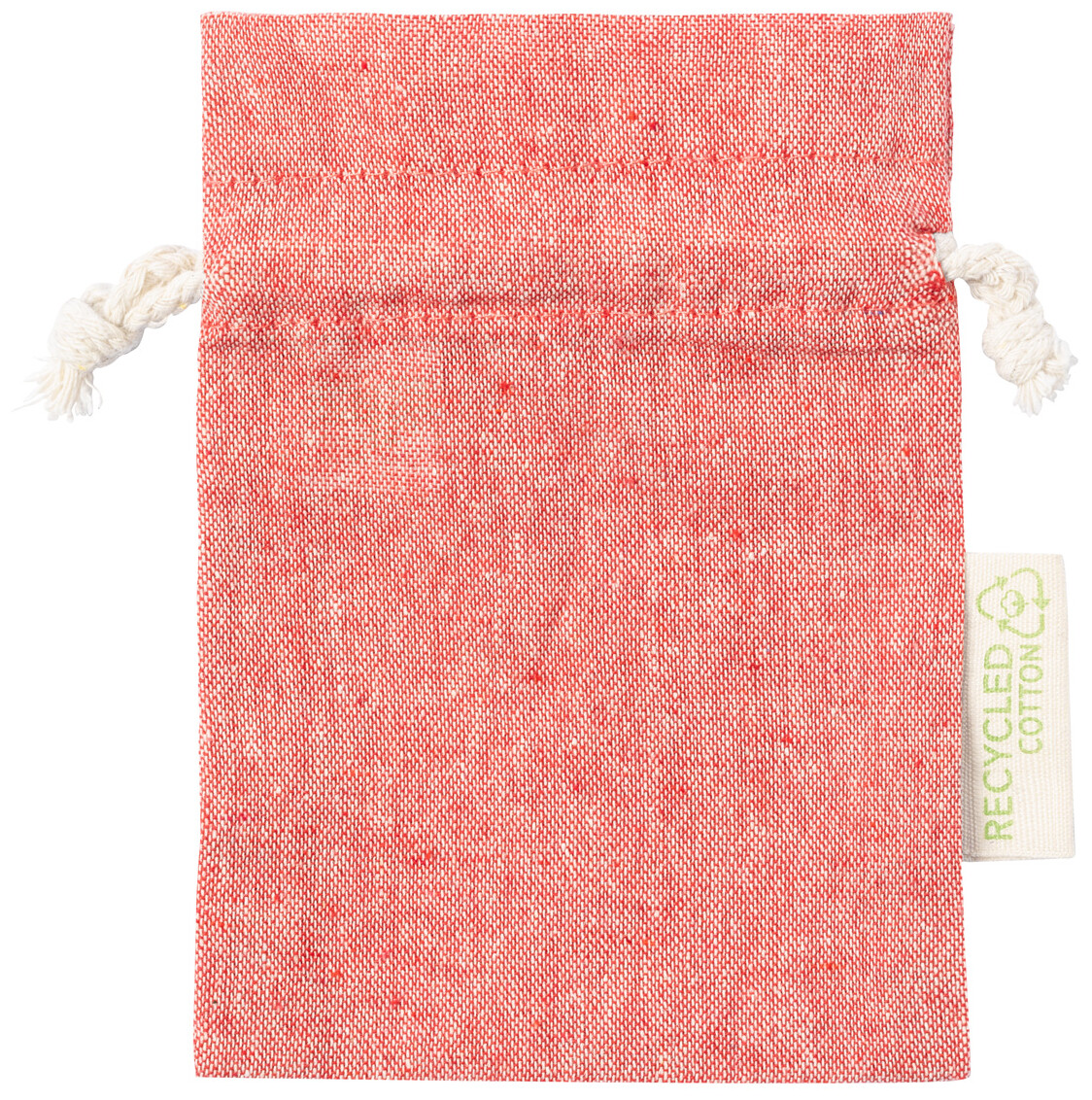 Dárkový pytlík z recyklované bavlny se stahováním na šňůrku. S výrazným štítkem z recyklované bavlny. 100% recyklovaná bavlna, 120 g/m2.
