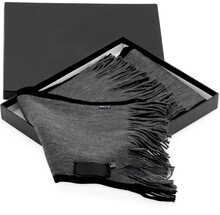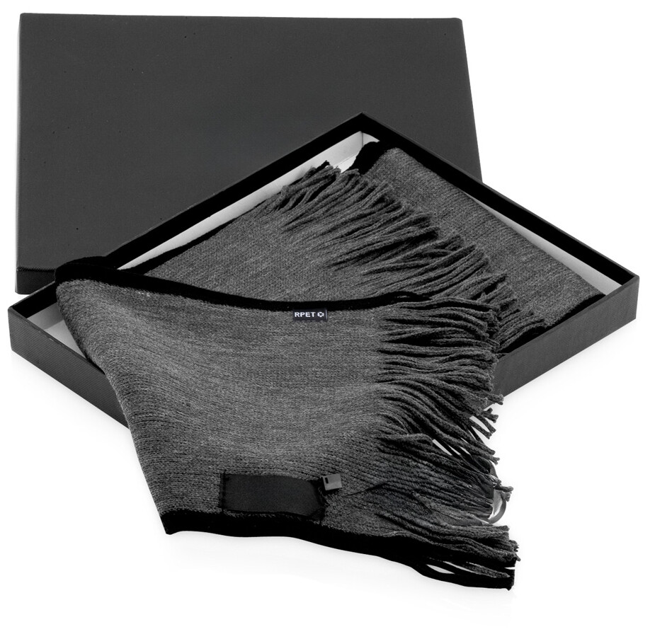 Elegantní, RPET polyesterová šála. V černé dárkové krabičce. S výrazným štítkem RPET.
