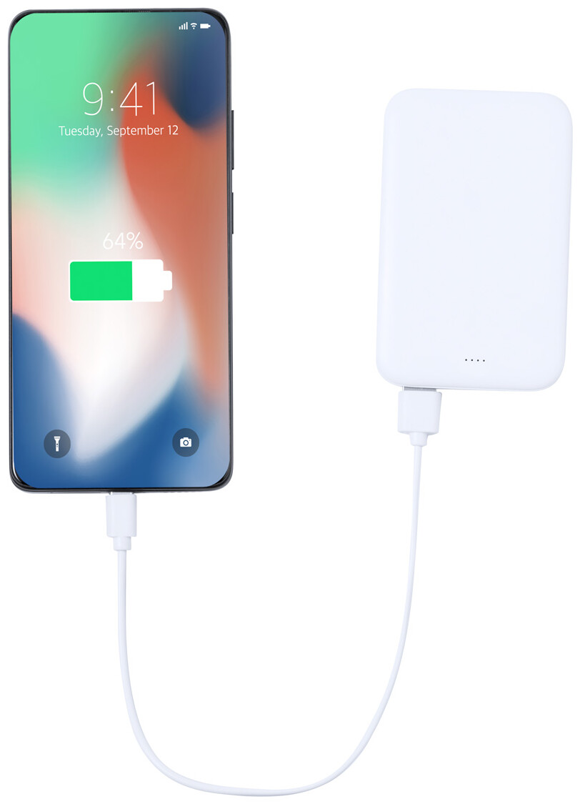 Powerbanka z recyklovaného ABS plastu s baterií 5000 mAh. Se 2 porty USB a 1 portem USB-C pro nabíječku. Vstupní port USB-C. Včetně USB nabíjecího kabelu.
