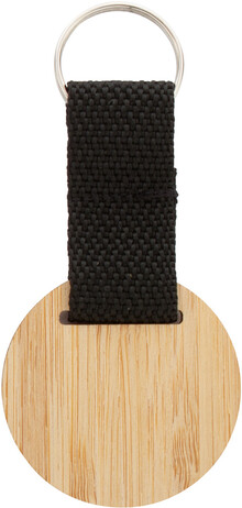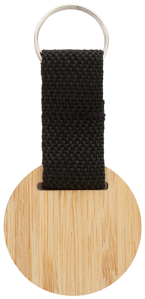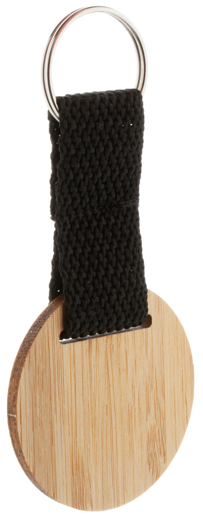 Přívěšek na klíče z bambusové překližky s polyesterovým páskem a kovovým kroužkem.