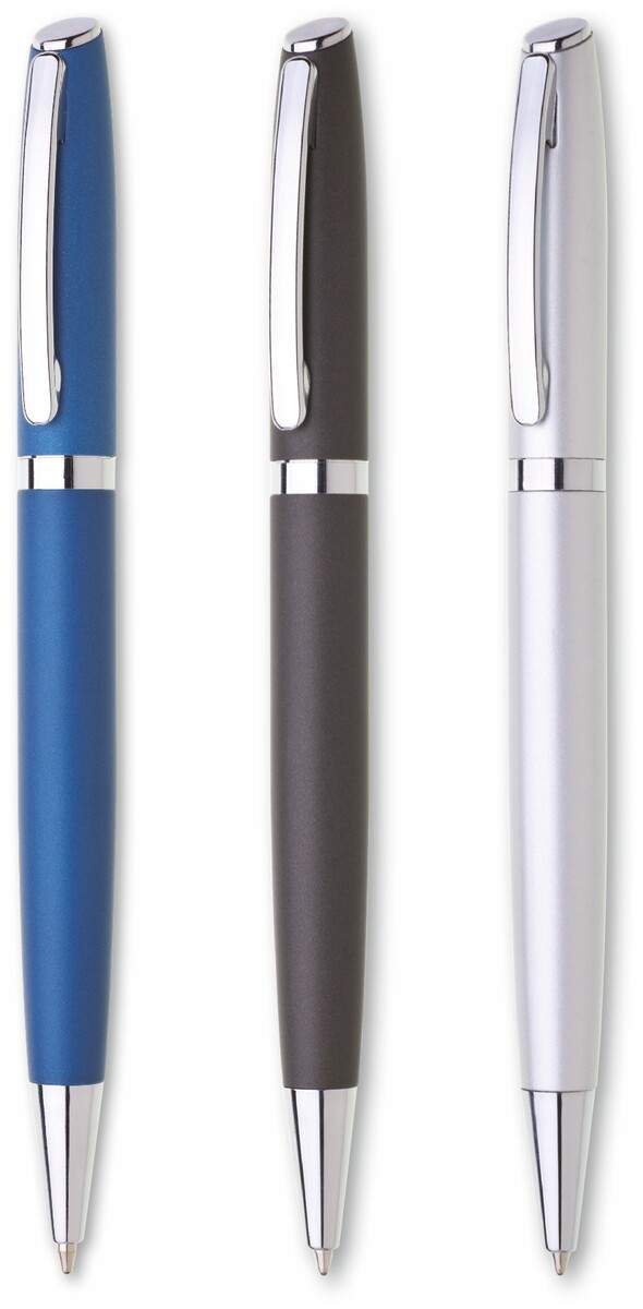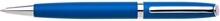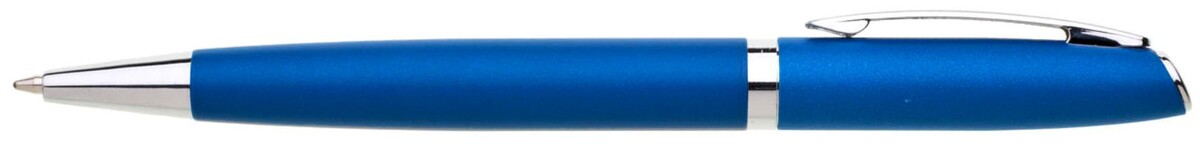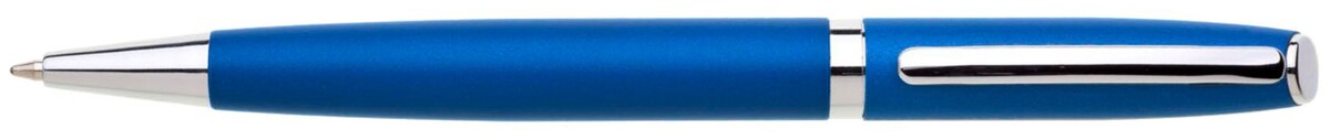Hliníková propiska TORICO s otočným mechanismem v barvě matně modré a stříbrnými doplňky. Náplň velkoobsahová, modře píšící.