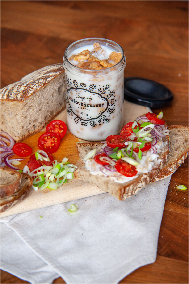 křupové, dozlatova usmažené vepřové škvarky zalité sněhobílým sádlem 320g