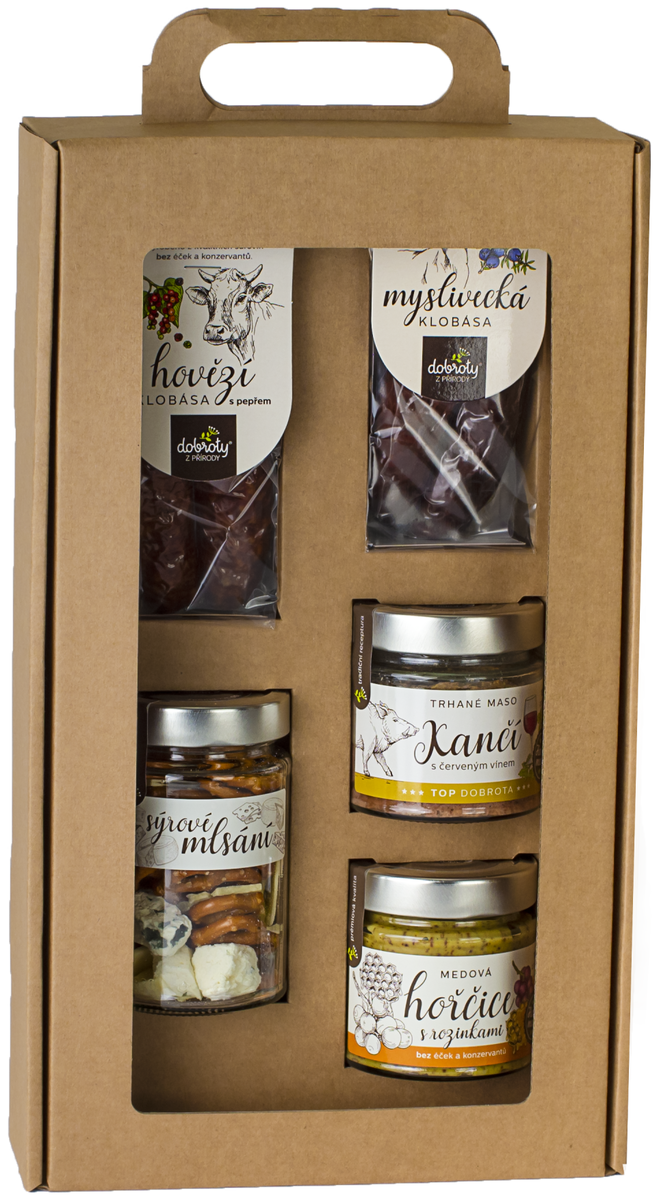 Sýrové mlsání (mix solené preclíky a lyofilizované sýry) 70g , Klobása hovězí s pepřem + Klobása myslivecká 2 ks / 90g, Hořčice medová s rozinkami 200g , Trhané maso kančí s červeným vínem 140 g