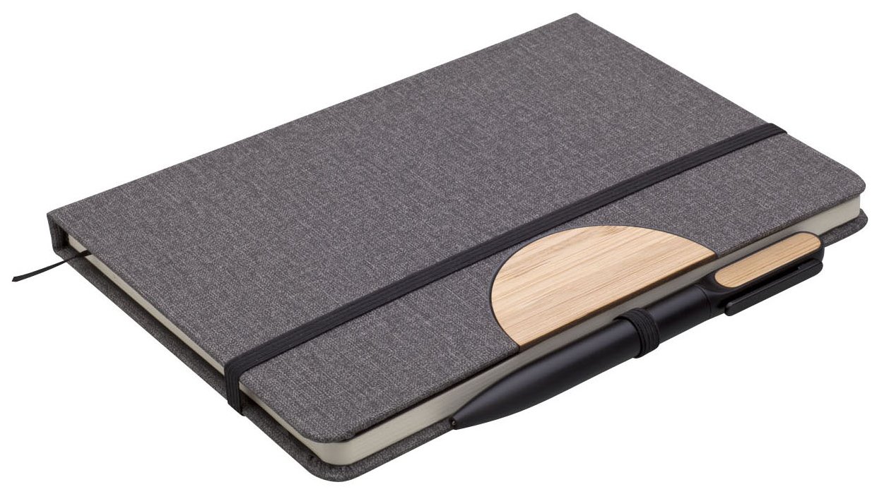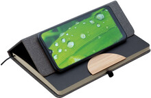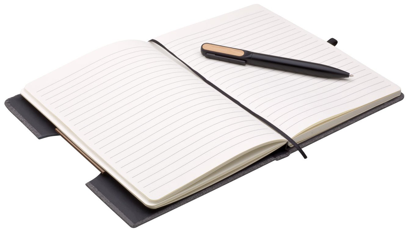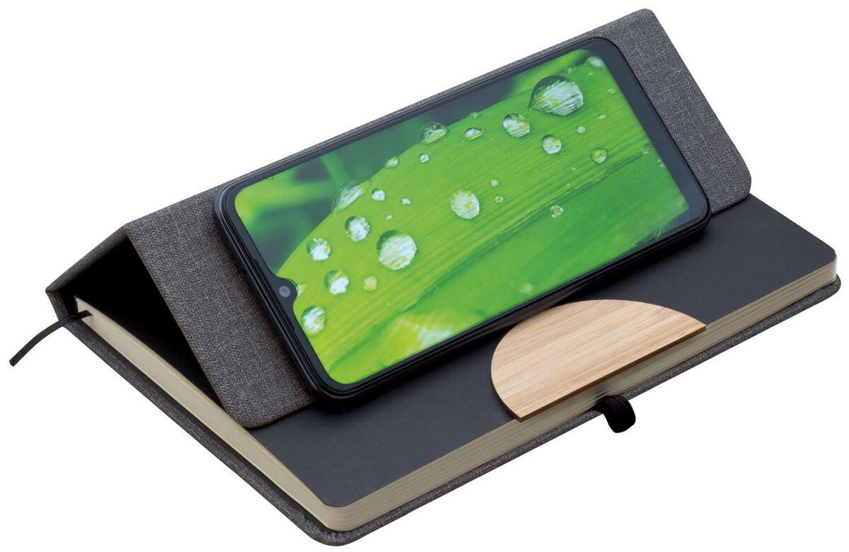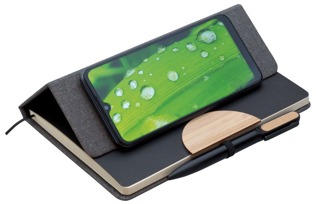 Poznámkový blok, zápisník v textilních deskách, které lze použít jako stojánek na mobil. V černé dárkové krabičce s otočnou propiskou s bambusovou vsadkou.