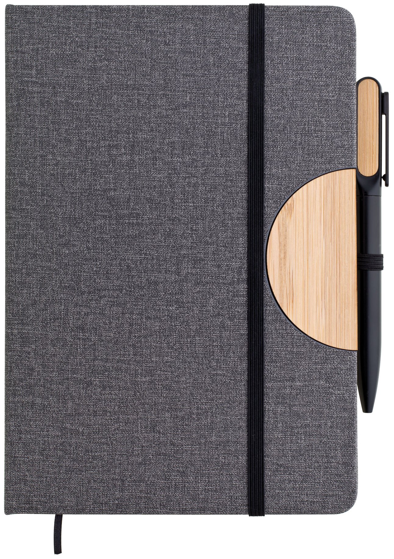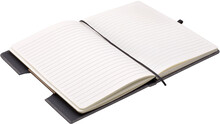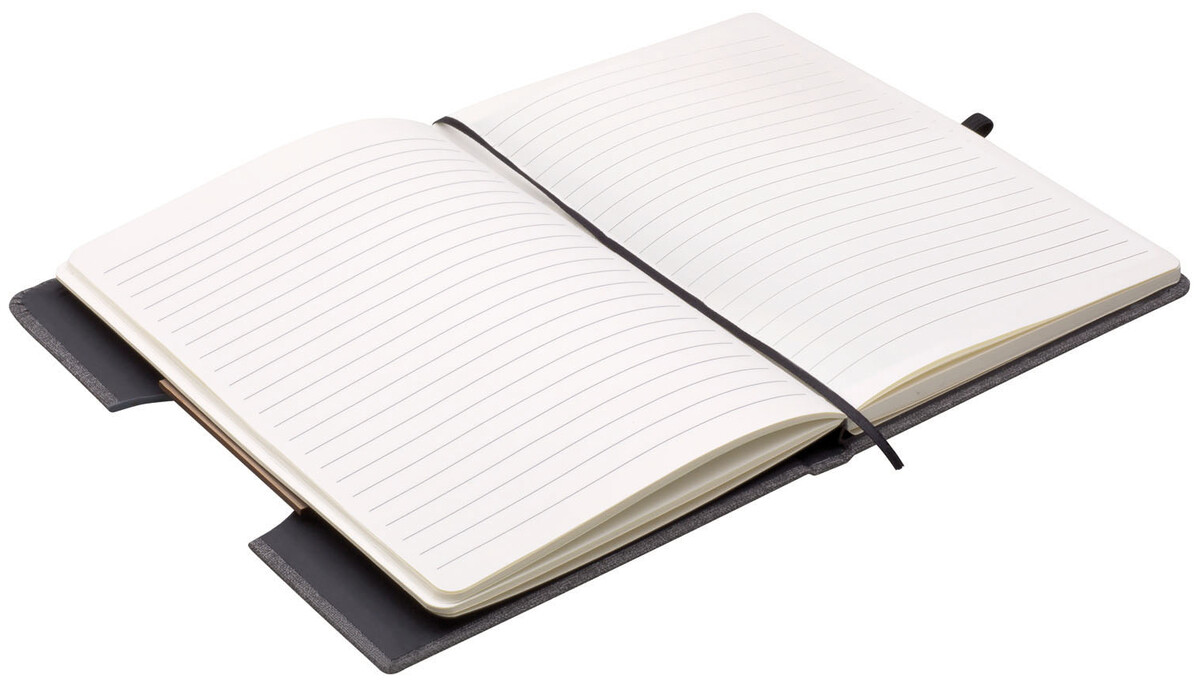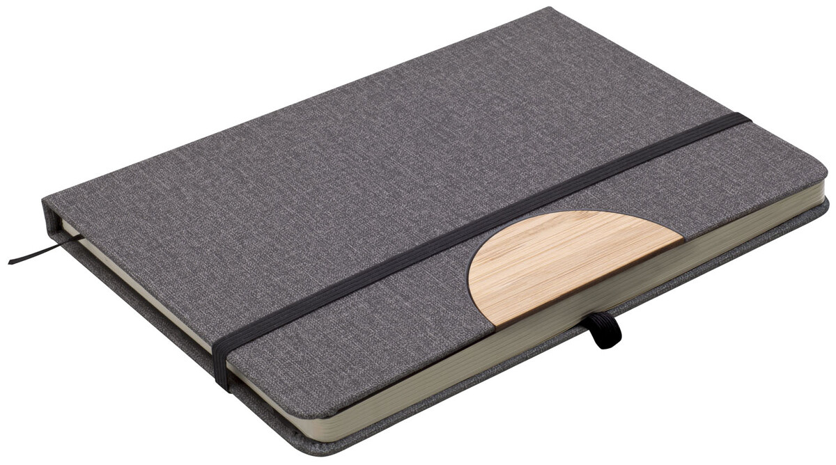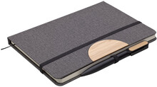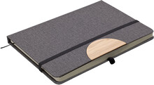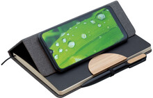 Poznámkový blok, zápisník v textilních deskách, které lze použít jako stojánek na mobil. V černé dárkové krabičce s otočnou propiskou s bambusovou vsadkou.