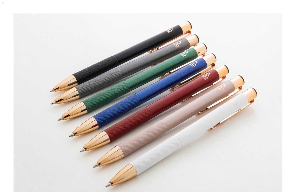 Kuličkové pero z recyklovaného hliníku s matným tělem, texturovaným úchopem a detaily růžového zlata. Se speciálním povrchem pro zrcadlové laserové gravírování v barvě růžového zlata. S modrou náplní.