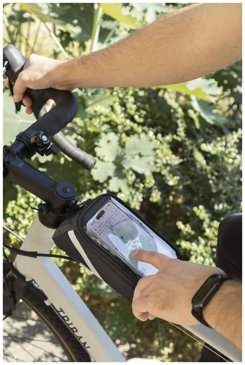 Brašna na rám kola z RPET s přihrádkou na zip, kapsou na mobil s dotykovou obrazovkou, nastavitelnými popruhy na suchý zip a reflexními proužky. Polyester 600D RPET s výrazným štítkem RPET.