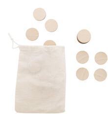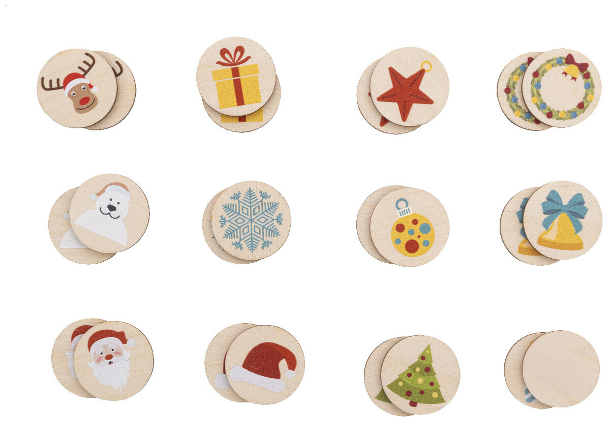 Pexeso z laminované březové překližky s vánočními motivy v bavlněném pytlíku. S 24 dlaždicemi (ø35 mm).