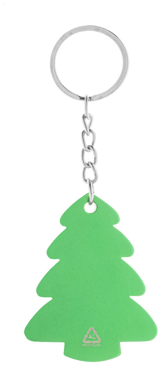 Přívěsek na klíče ve tvaru vánočního stromečku z recyklovaného hliníku s kovovým kroužkem.