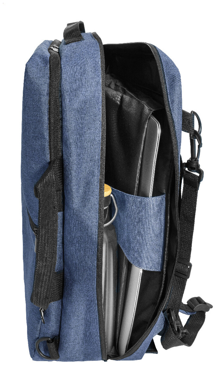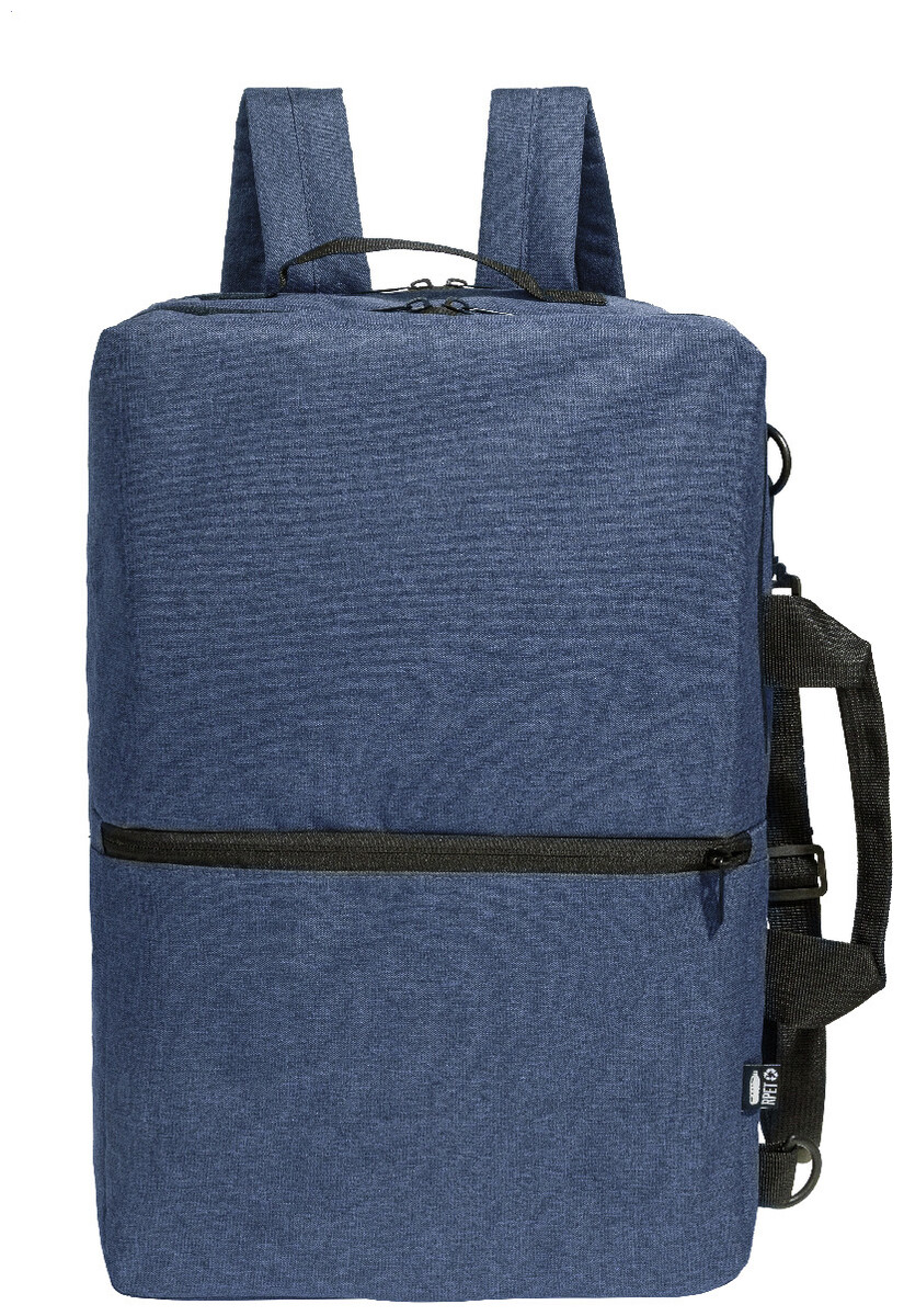 Dvojfunkční RPET batoh a taška na dokumenty s přihrádkou na zip, 2 předními kapsami na zip a polstrovanou přihrádkou na notebook (15"). S polstrovanými zády a ramenními popruhy. Součástí je i odnímatelný ramenní popruh pro použití jako taška na dokumenty. 600D RPET polyester s výrazným štítkem RPET.