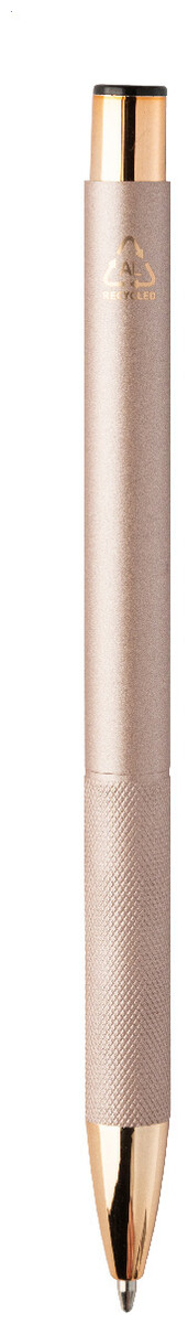 Kuličkové pero z recyklovaného hliníku s matným tělem, texturovaným úchopem a detaily růžového zlata. Se speciálním povrchem pro zrcadlové laserové gravírování v barvě růžového zlata. S modrou náplní.