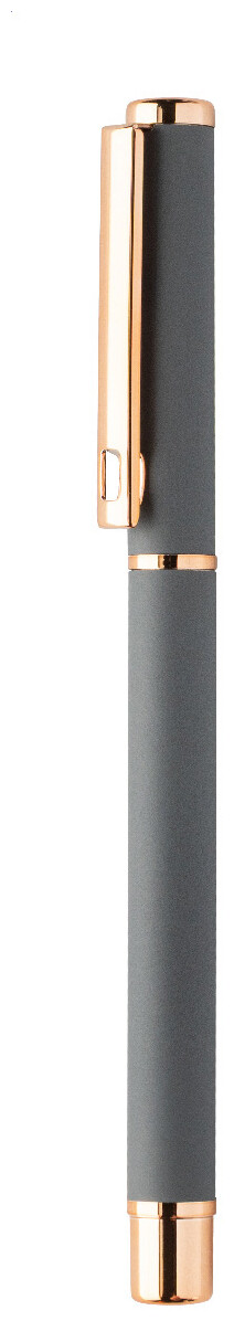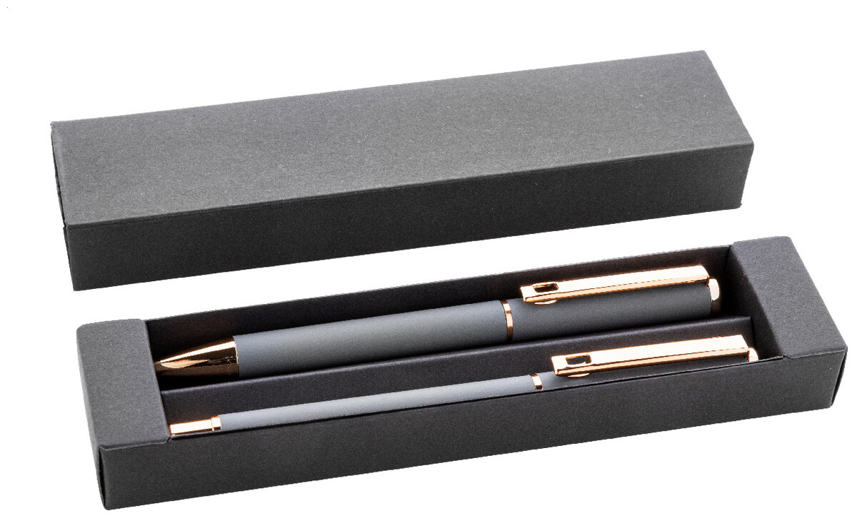 Sada per z recyklovaného hliníku s kuličkovým perem a rollerem s pogumovaným povrchem a detaily růžového zlata. S modrou náplní. Se speciálním povrchem pro zrcadlové laserové gravírování v růžovo-zlaté barvě. V černé papírové dárkové krabičce.