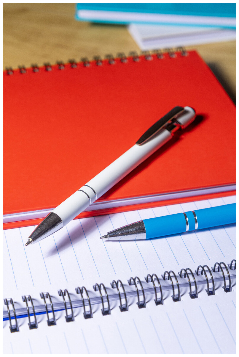 Kuličkové pero a pero pro dotykovou obrazovku z recyklovaného hliníku s pogumovaným tělem a chromovanými detaily. S modrou náplní.