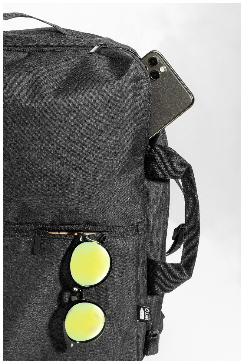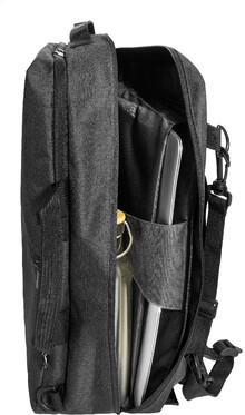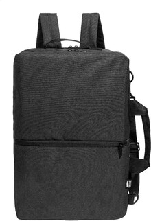 Dvojfunkční RPET batoh a taška na dokumenty s přihrádkou na zip, 2 předními kapsami na zip a polstrovanou přihrádkou na notebook (15"). S polstrovanými zády a ramenními popruhy. Součástí je i odnímatelný ramenní popruh pro použití jako taška na dokumenty. 600D RPET polyester s výrazným štítkem RPET.
