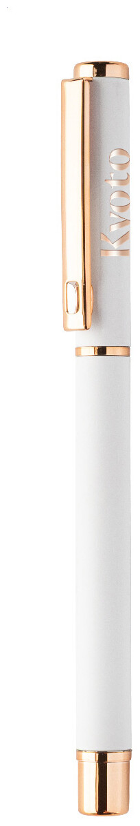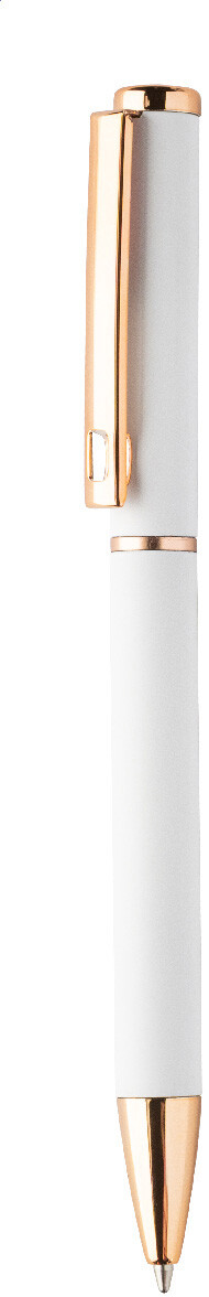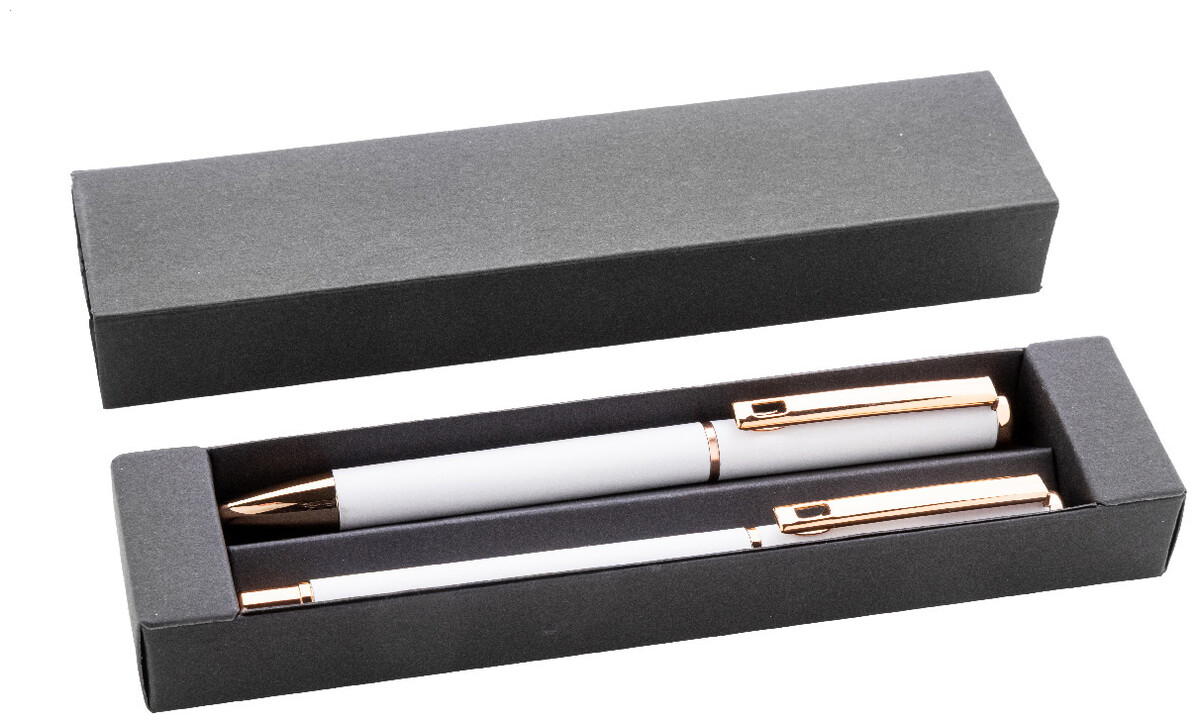 Sada per z recyklovaného hliníku s kuličkovým perem a rollerem s pogumovaným povrchem a detaily růžového zlata. S modrou náplní. Se speciálním povrchem pro zrcadlové laserové gravírování v růžovo-zlaté barvě. V černé papírové dárkové krabičce.