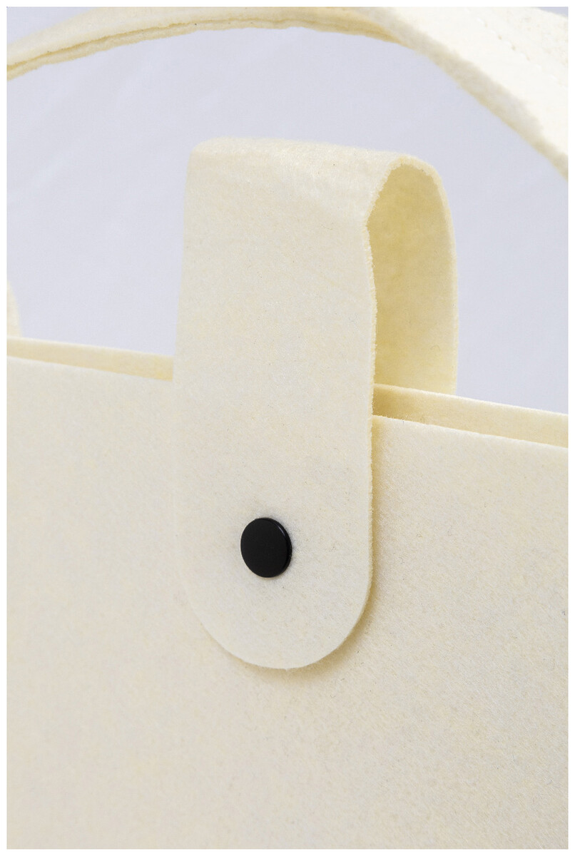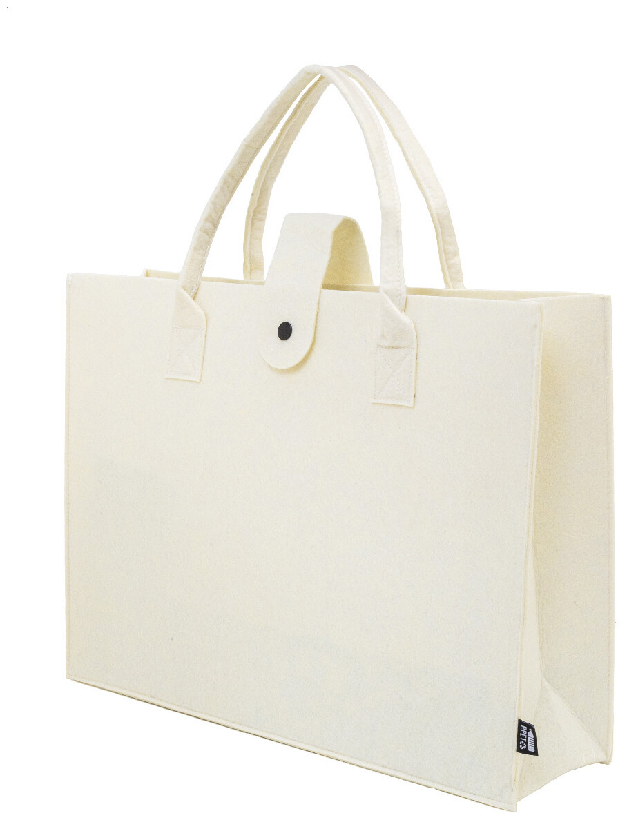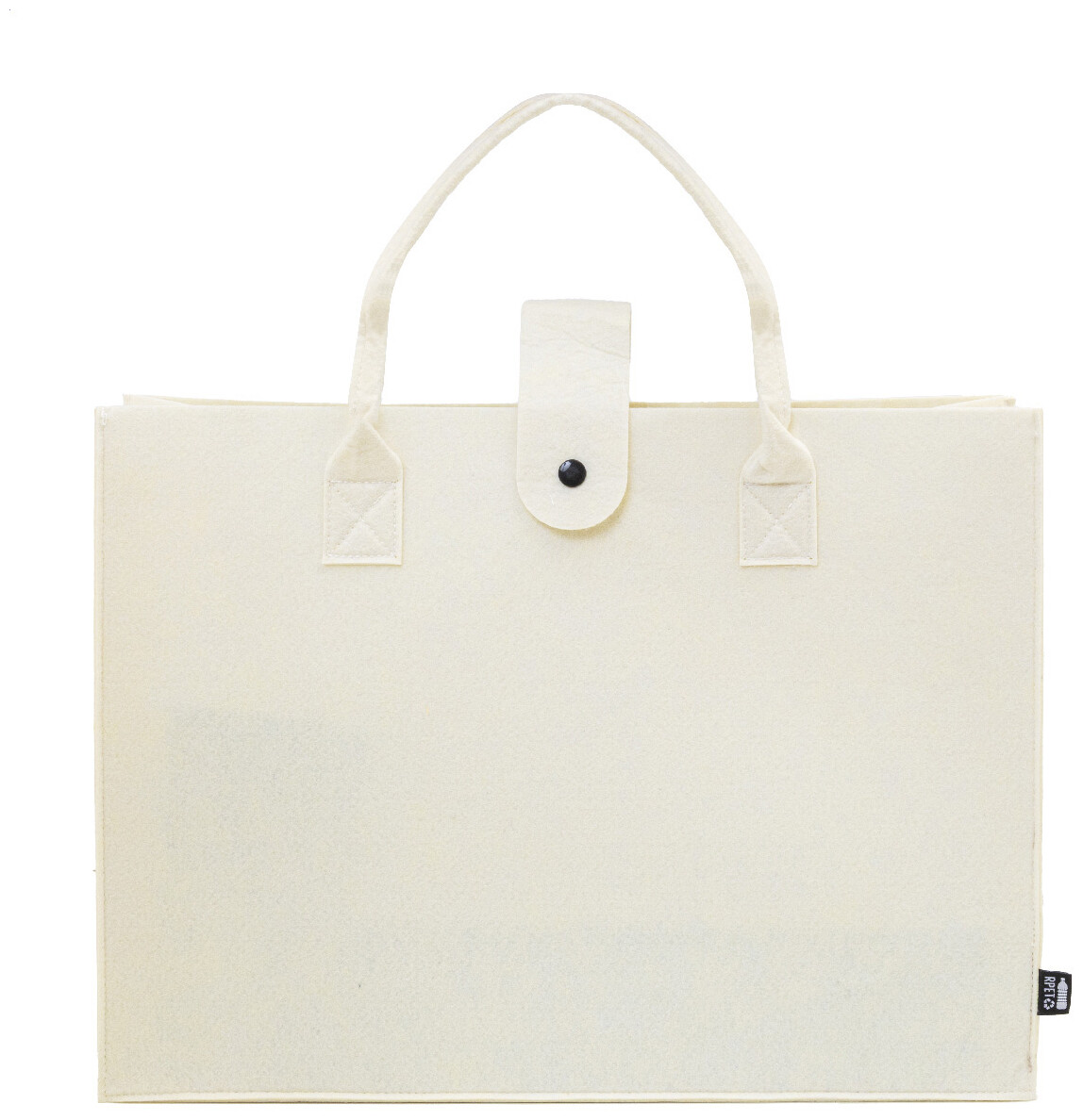 Nákupní taška z RPET plsti s klínkem, zapínáním na knoflíky a krátkými uchy. S výraznou etiketou z RPET.