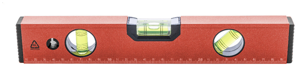 Magnetická vodováha z recyklovaného hliníku se třemi vodováhami (horizontální, vertikální a 45°) a 30cm pravítkem.