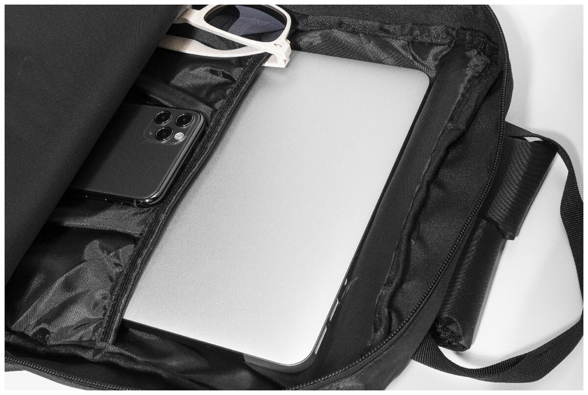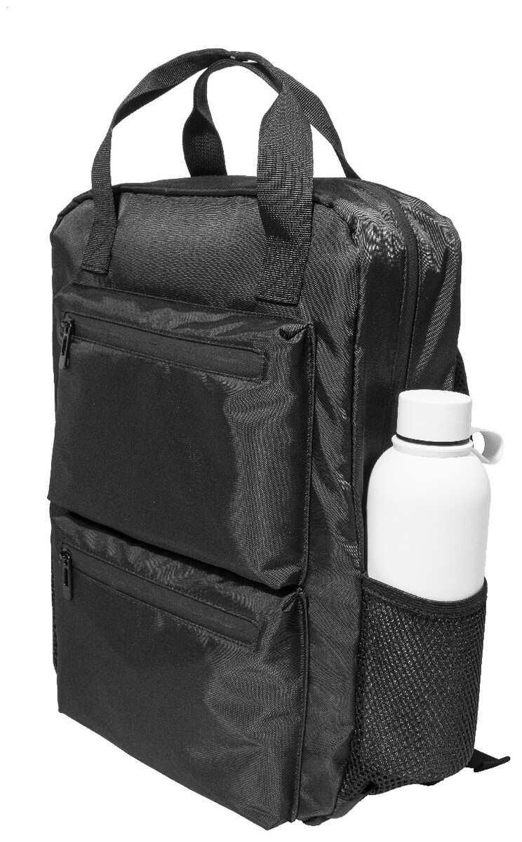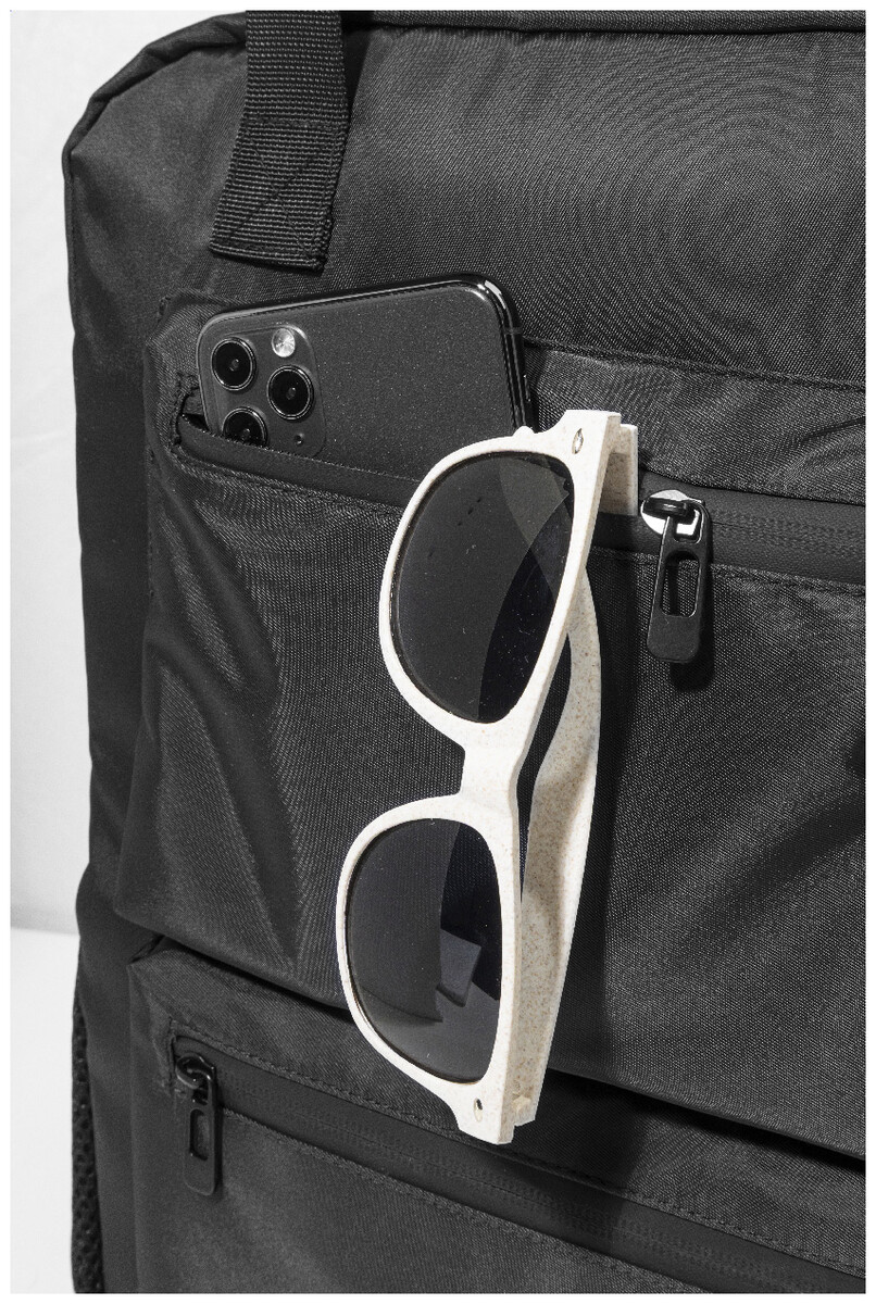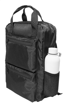 Batoh z RPET s přihrádkou na zip, 2 předními kapsami na zip, polstrovanou přihrádkou na notebook (15") a bočními síťovanými kapsami. S polstrovanými zády a ramenními popruhy, kapsou proti krádeži a popruhem na kolečkách. RPET keprový polyester s výrazným štítkem RPET.