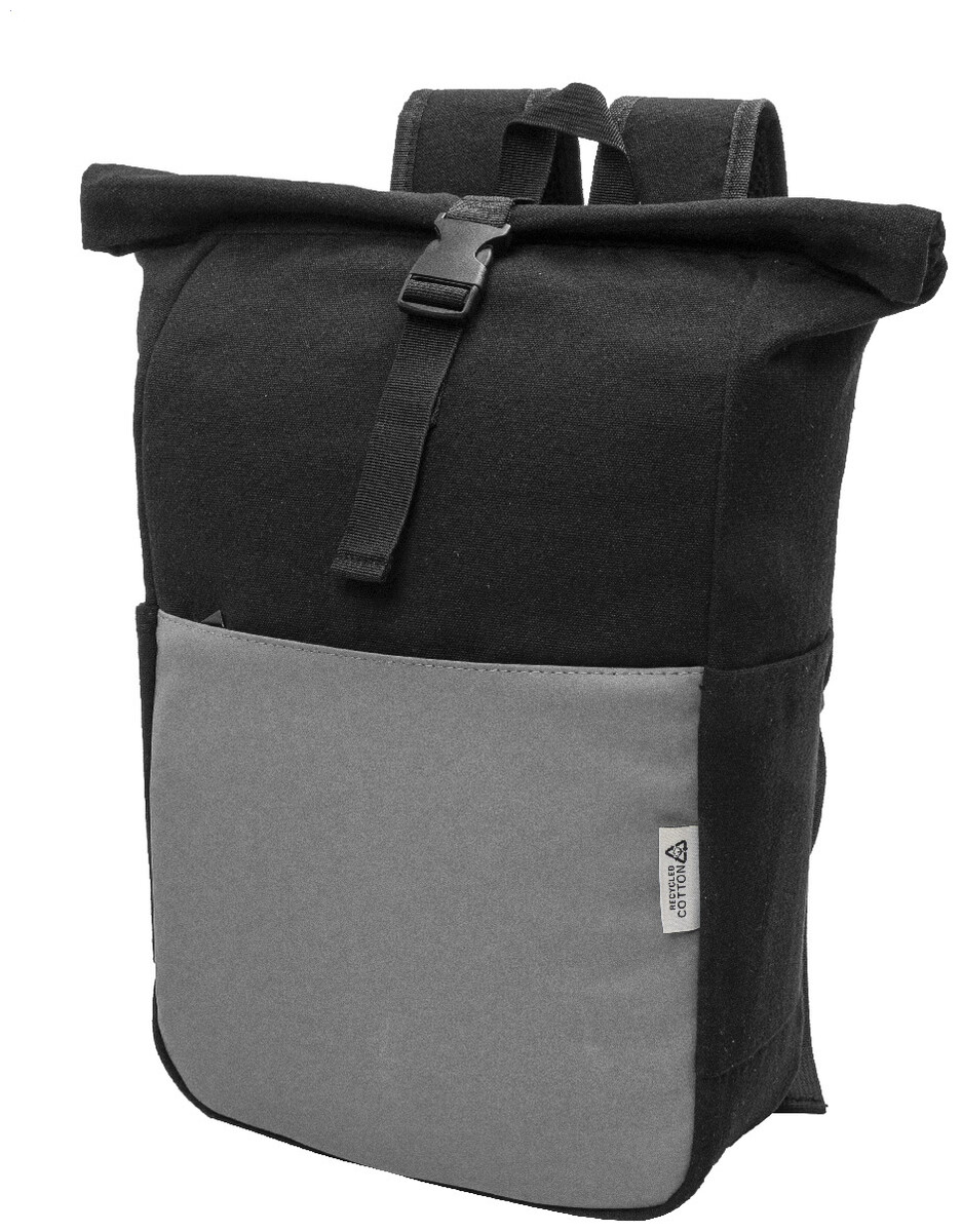Rolovací batoh z recyklovaného plátna se zapínáním na přezku a přední kapsou na zip z měkké recyklované PU kůže. S polstrovanou přihrádkou na notebook (15"), bočními kapsami, polstrovanými zády a ramenními popruhy. 70% recyklované bavlny a 30% RPET polyesteru. S výrazným štítkem z recyklované bavlny.