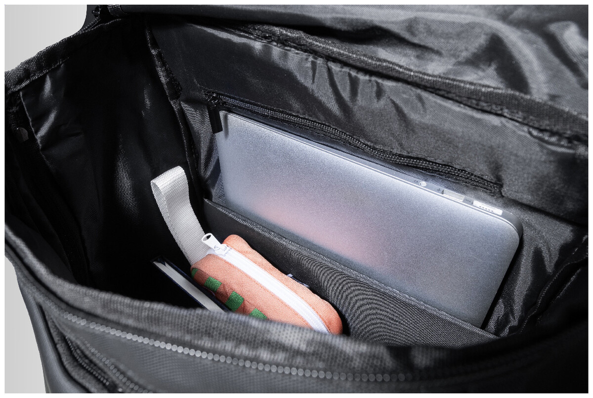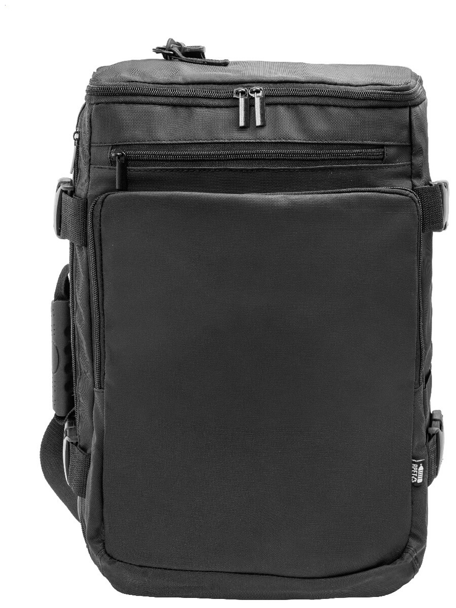 Voděodolný batoh a taška na dokumenty z RPET s dvojitou funkcí, hlavní přihrádkou na zip, dvěma předními kapsami na zip, boční kapsou, bočními popruhy s přezkou a polstrovanou přihrádkou na notebook (15"). S polstrovanými zády a odnímatelnými ramenními popruhy. Součástí je i další odnímatelný ramenní popruh pro použití jako taška na dokumenty. Polyester 600D RPET s PU zátěrem a výrazným štítkem RPET.