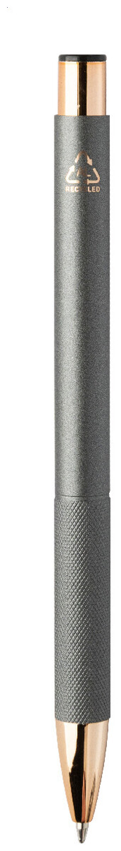Kuličkové pero z recyklovaného hliníku s matným tělem, texturovaným úchopem a detaily růžového zlata. Se speciálním povrchem pro zrcadlové laserové gravírování v barvě růžového zlata. S modrou náplní.