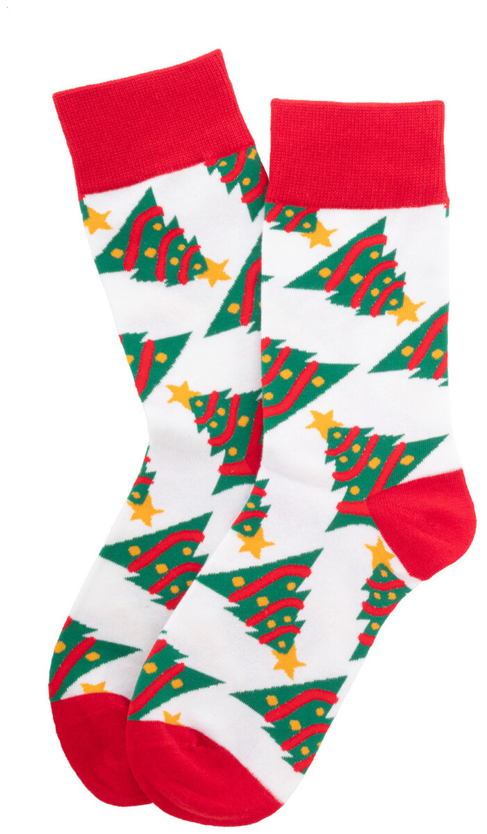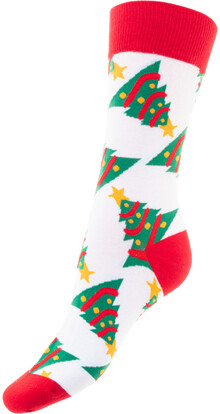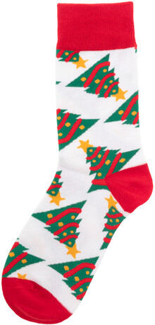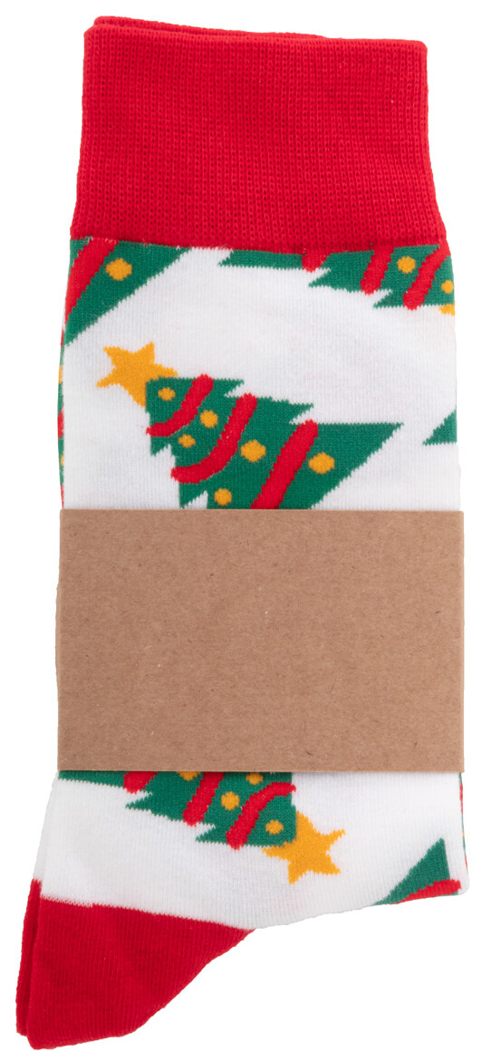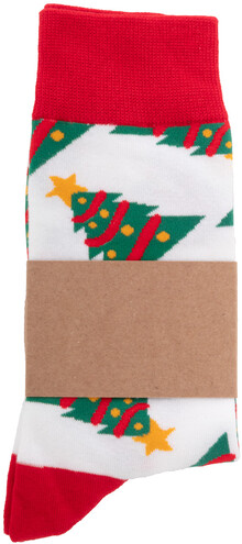 Pár vánočních ponožek ze 73 % bavlny, 25 % RPET polyesteru a 2 % spandexu. S potisknutelným sulfátovým papírem.